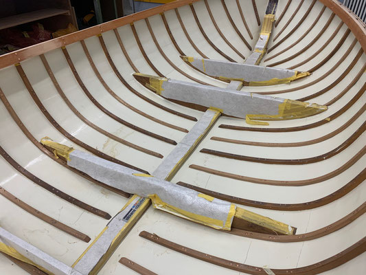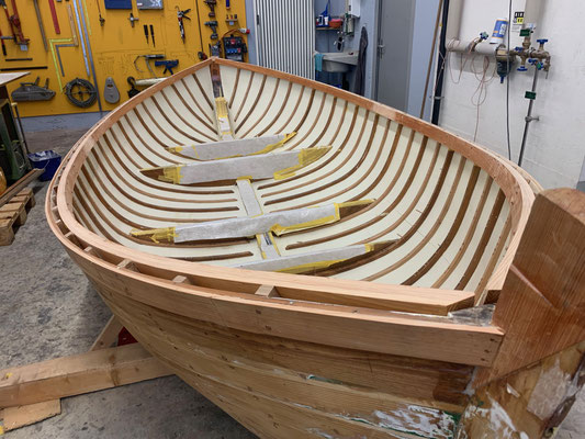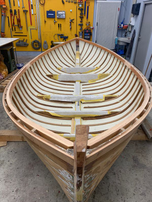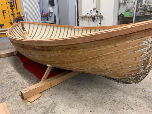 Dieses Holzschmuckstück vom Gomersee bekam neue Spanten, einen neuen Innenkiel, Dollbaum und schon bald einen neuen, offenen Innenausbau aus Holz.